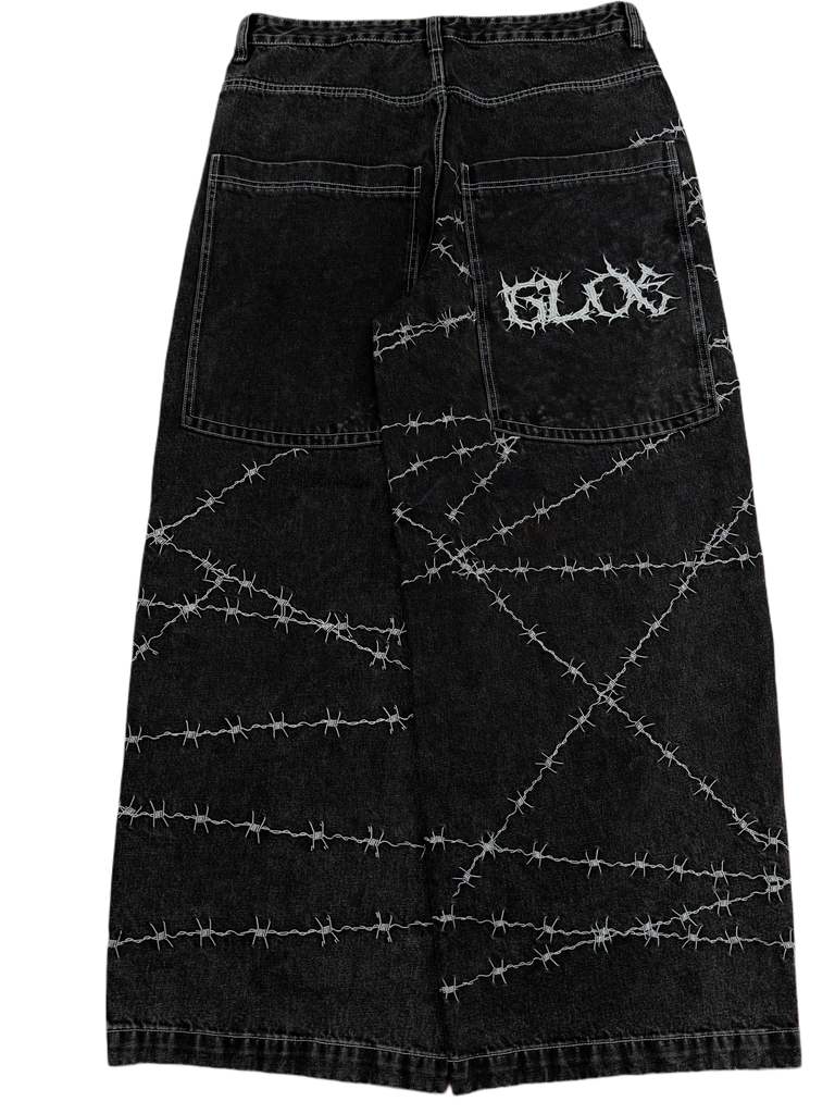 WASHED BLACK AND GRAY WIDE-LEG EMBROIDERED JEANS