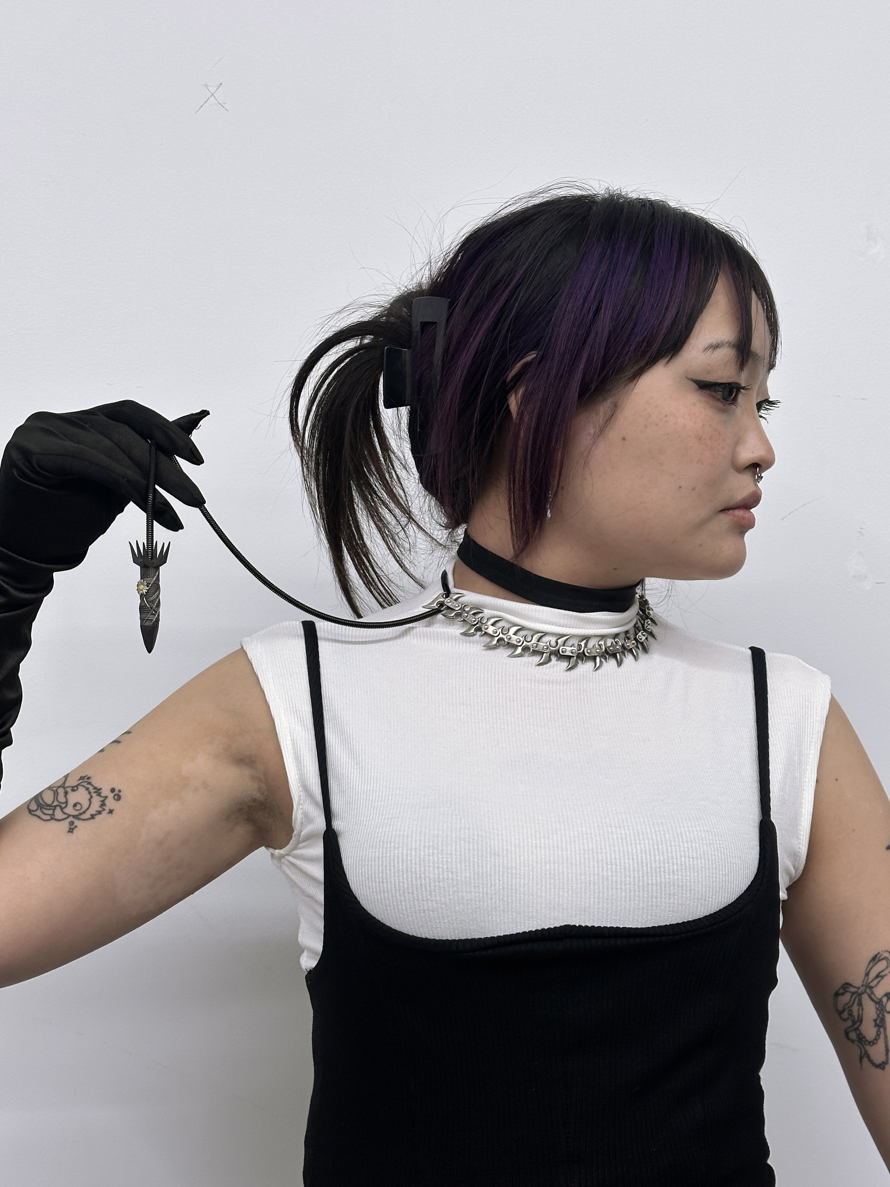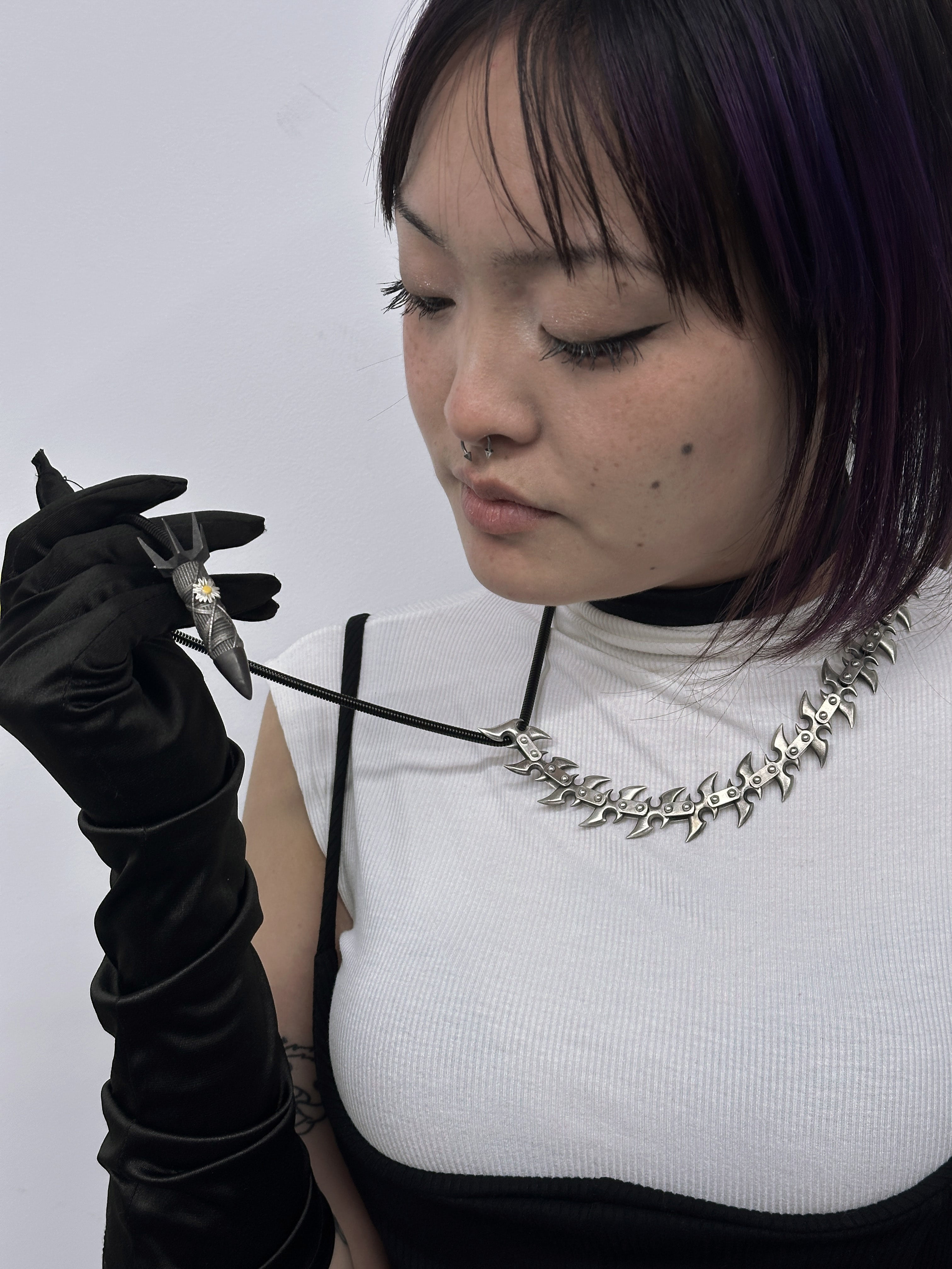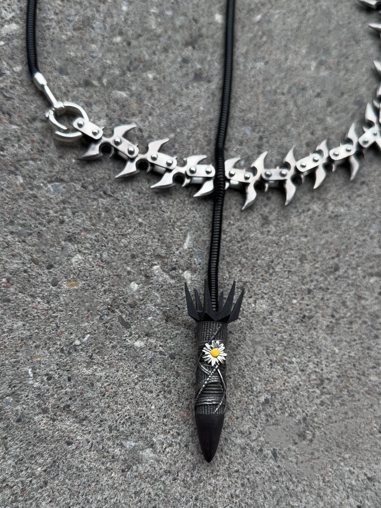It includes a small enamel flower, a hidden heart on a spring inside the bomb pendant, and a sliding charm that moves freely along the chain. Each piece is carefully assembled to create a detailed, durable accessory that feels alive when you wear it.