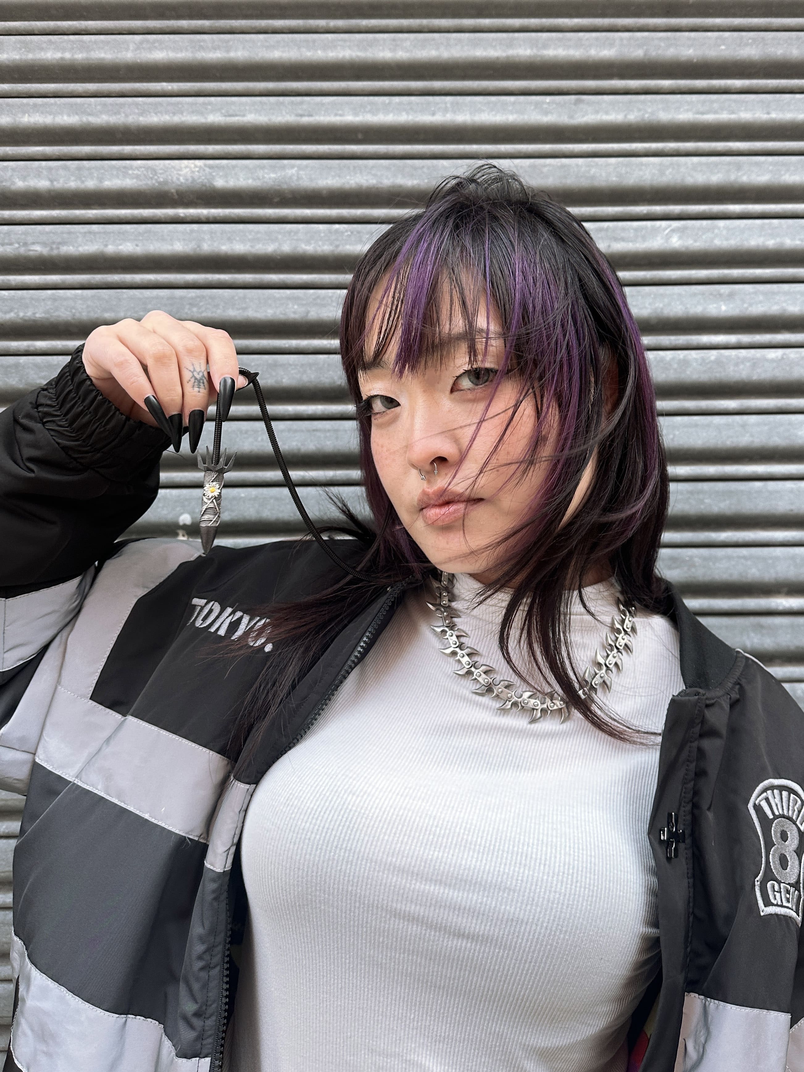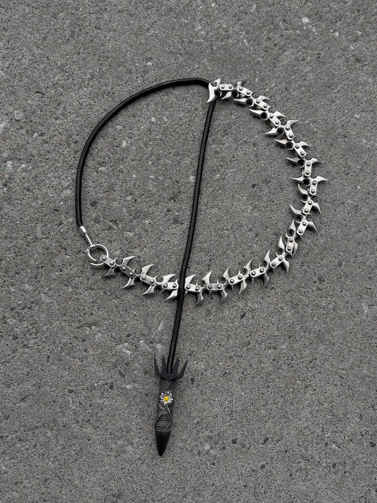 This necklace is made of 100% stainless steel and a snake chain. It features a custom chainsaw-style chain and a set of playful, movable elements you can adjust and arrange however you like.