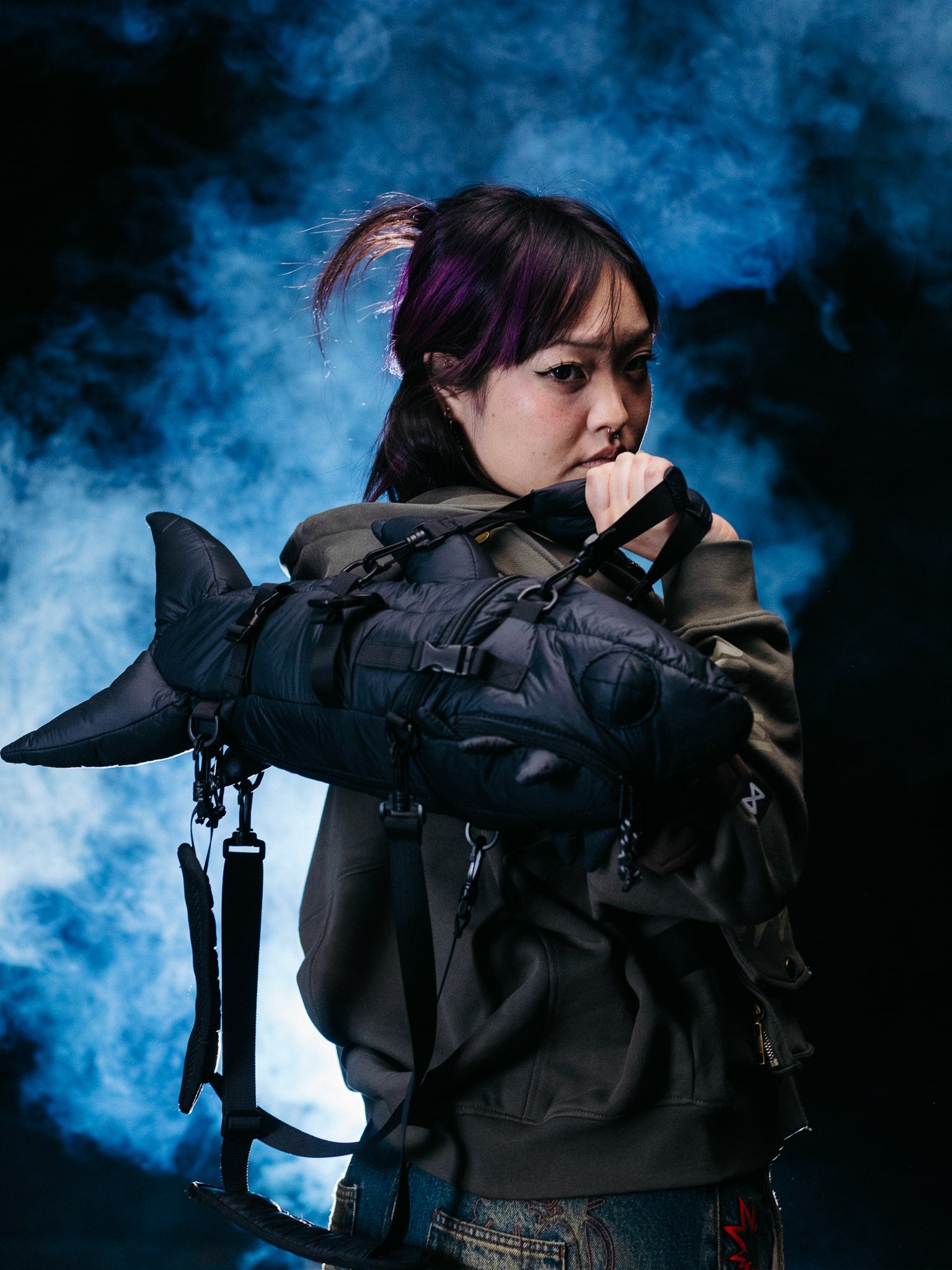 You can wear it in two ways: as a backpack or a regular bag with detachable straps. It has one big pocket that takes up the entire space inside the shark, and a small pocket on the bottom where you can store the removed strap set or small belongings like a phone.